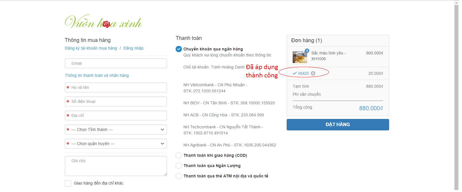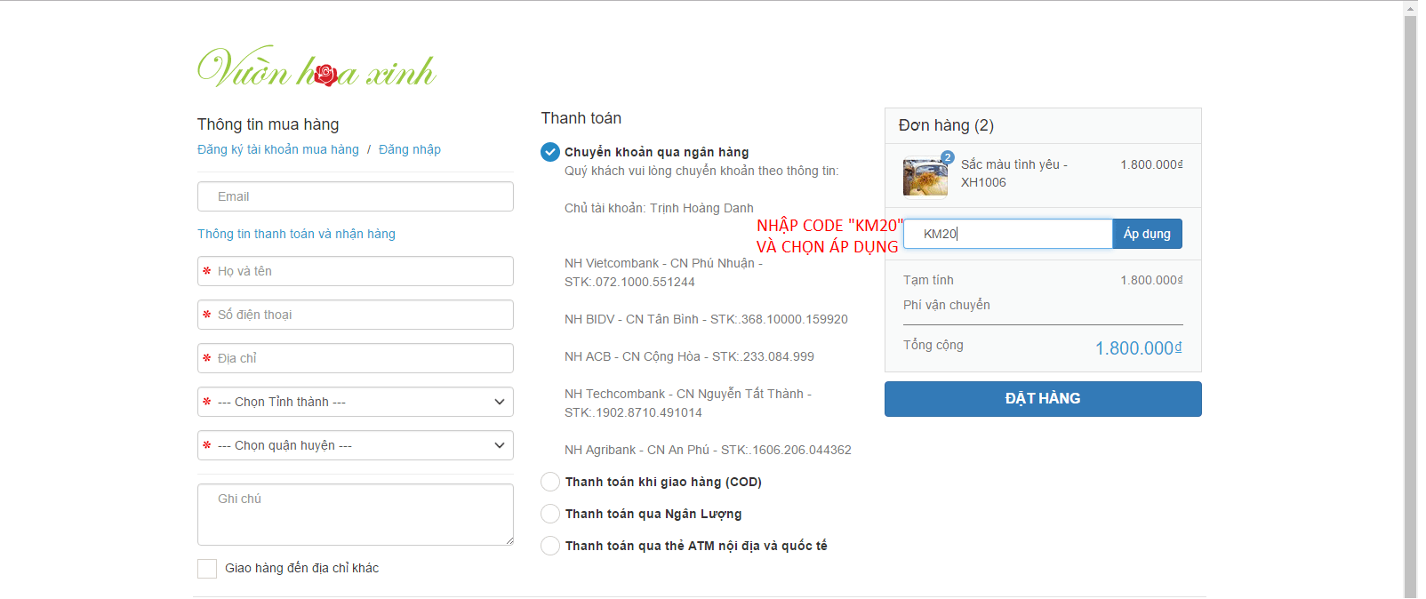 Bước 1: Nhập Code KM20 khi đặt hàng