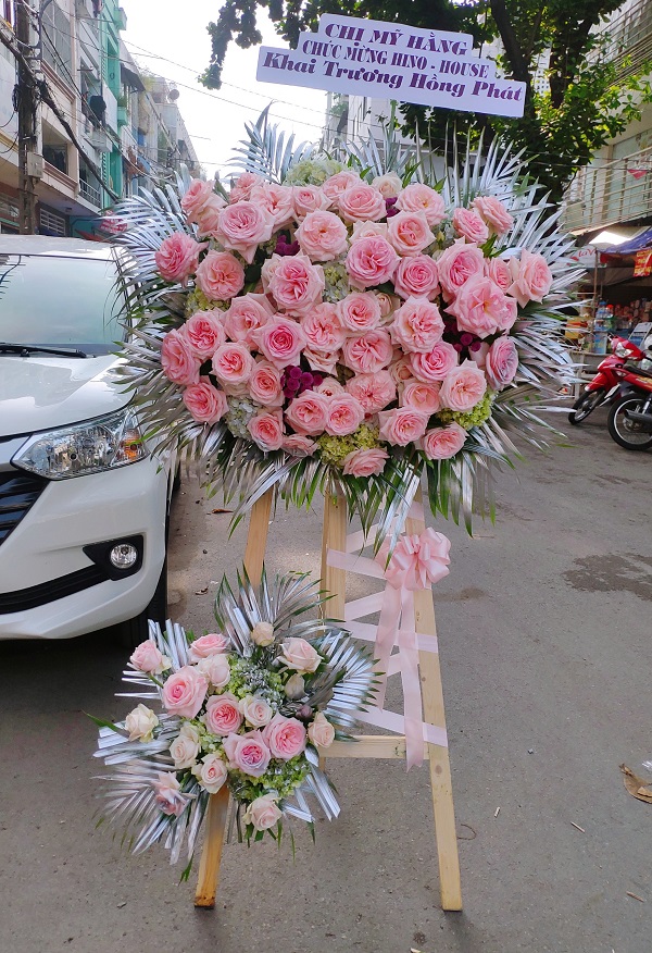 Kệ hoa với tone màu hồng hiện đại, trẻ trung thật sự nổi bật so với các kệ hoa truyền thống mang ý nghĩa về một lời chúc tấn tài tấn lộc. Thích hợp tặng trong dịp chúc mừng, khai trương, kỉ niệm.