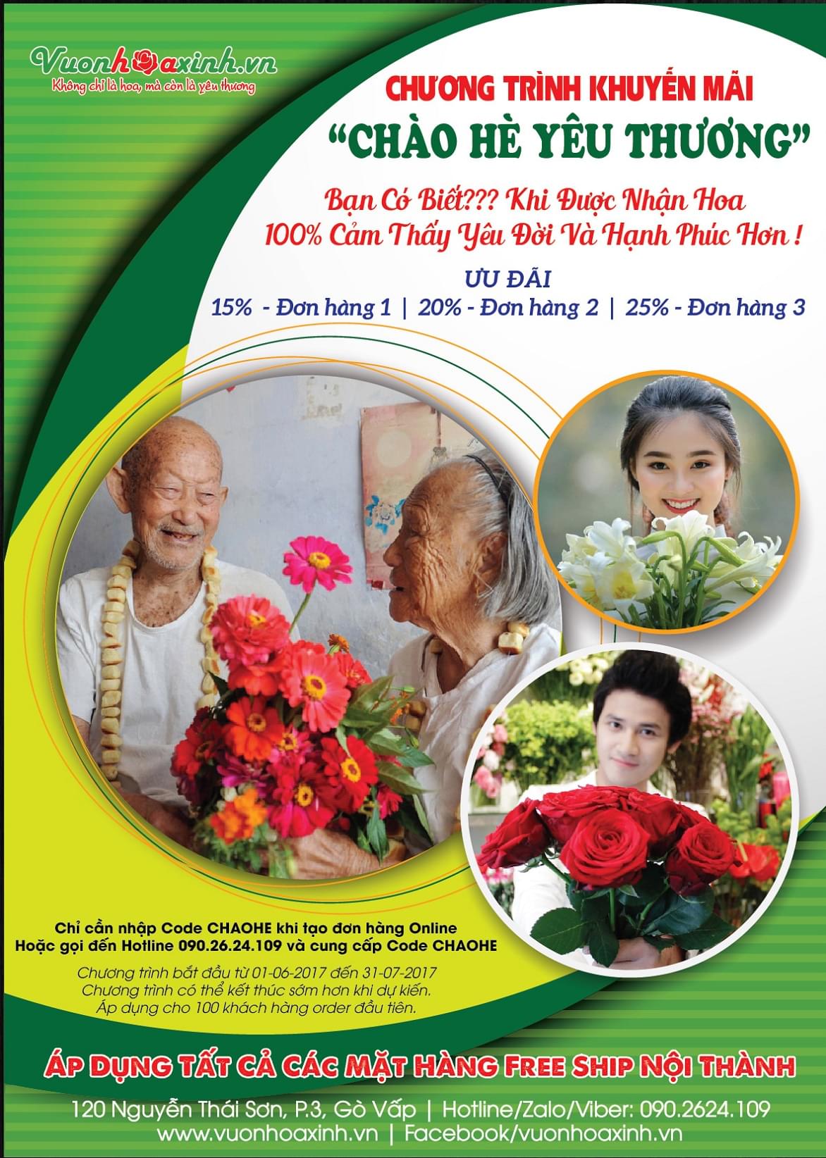 Nhằm tạo điều kiện để mọi người có thể gởi yêu thương bằng những đóa hoa được dễ dàng hơn với chi phí tiết kiệm hơn. Và giúp mọi người có thói quen tặng hoa như một món quà trao yêu thương. Vườn Hoa Xinh có chương trình khuyến mãi ưu đãi “CHÀO HÈ YÊU THƯƠNG”