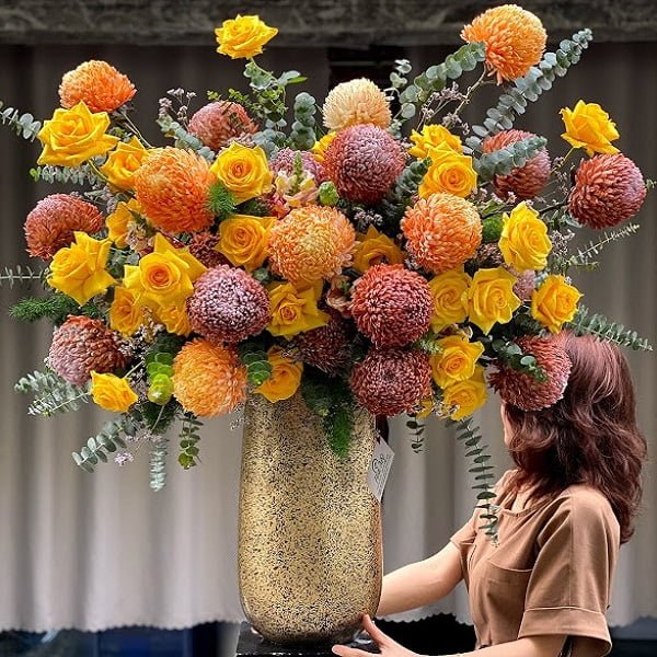 - Số lượng hoa gồm: Từ 20-22 hoa cúc mẫu đơn nâu, cam Hà Lan, từ 20-22 hoa hồng vàng ánh kim, lá bạc thơm, bình cao cấp
