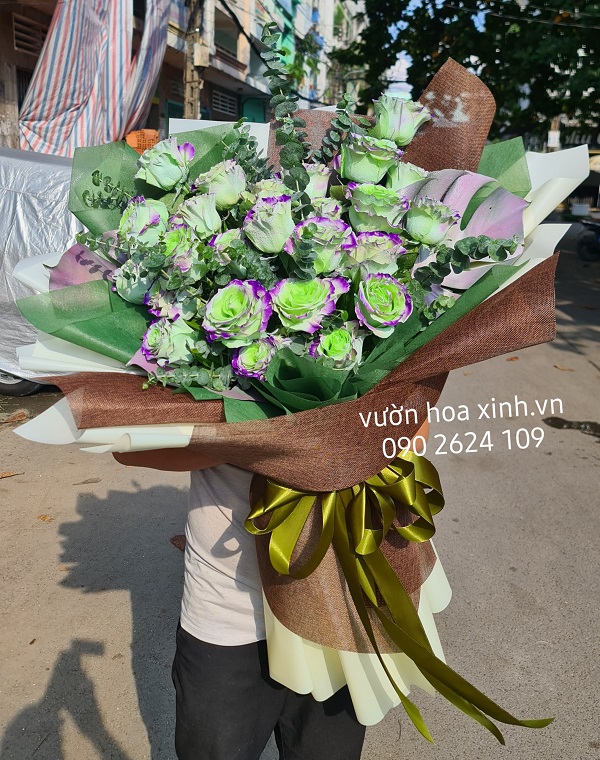 Bó hoa gồm: 25 cành hồng Ecuador màu Aquamarine cực đẹp, độc ,lạ, sang trọng kết hợp với lá bạc, giấy gói cao cấp