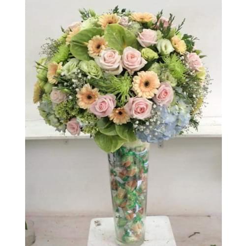 Hoa bình tươi tắn ♥ Kiêu sa với mẫu hoa bình Nắng ban mai. Sự kết hợp của hoa hồng và hoa cát tượng tạo nên vè đẹp xinh xắn cho ngôi nhà của bạn